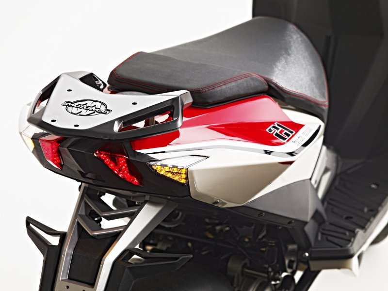 Stylizacja tego pojazdu wskazuje na odlotową wyobraźnię konstruktora. Przedni reflektor jak i kierunkowskazy wzbogacone o diody na pewno nie pozwolą przejść obok tego skutera obojętnie.